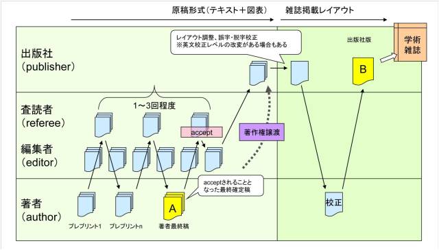 下図の[A]の原稿が「著者最終稿」となります。レイアウト等が整ったProof原稿は「著者最終稿」には当たりません。