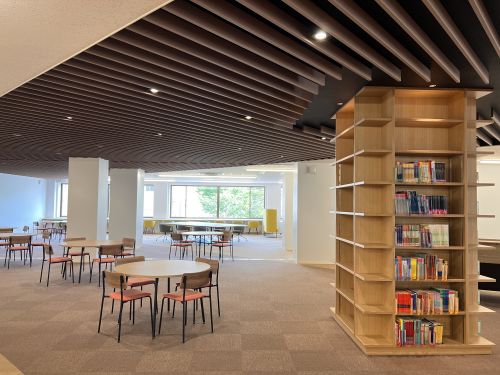 アクティブラーニングスペースの丸テーブル。近くに柱巻書架があります。 - プレゼンテーションスペース