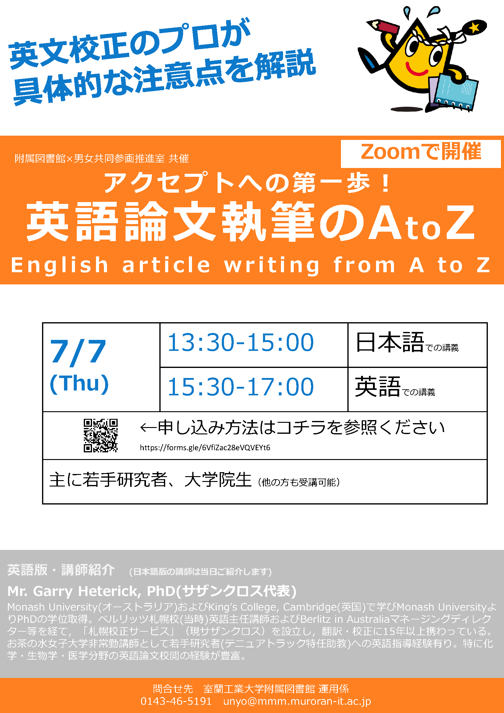 主な対象: 若手研究者、大学院生(他の方も受講可能) 内容: 英語論文執筆上の具体的な注意点を 英文校正の専門家から学びます。 日時:2022年7月7日(木) 【日本語での講義】13:30-15:00(90分) 【英語での講義】 15:30-17:00(90分) 開催方法:Zoomによるオンラインセミナー 共催:男女共同参画推進室 講師:Mr. Garry Heterick, PhD(サザンクロス 株式会社 代表) 問合せ先:附属図書館 運用係 0143-46-5191 参加申込は「コチラ」 →申込後、参加用URLが記載された返信メールが届きます。 |