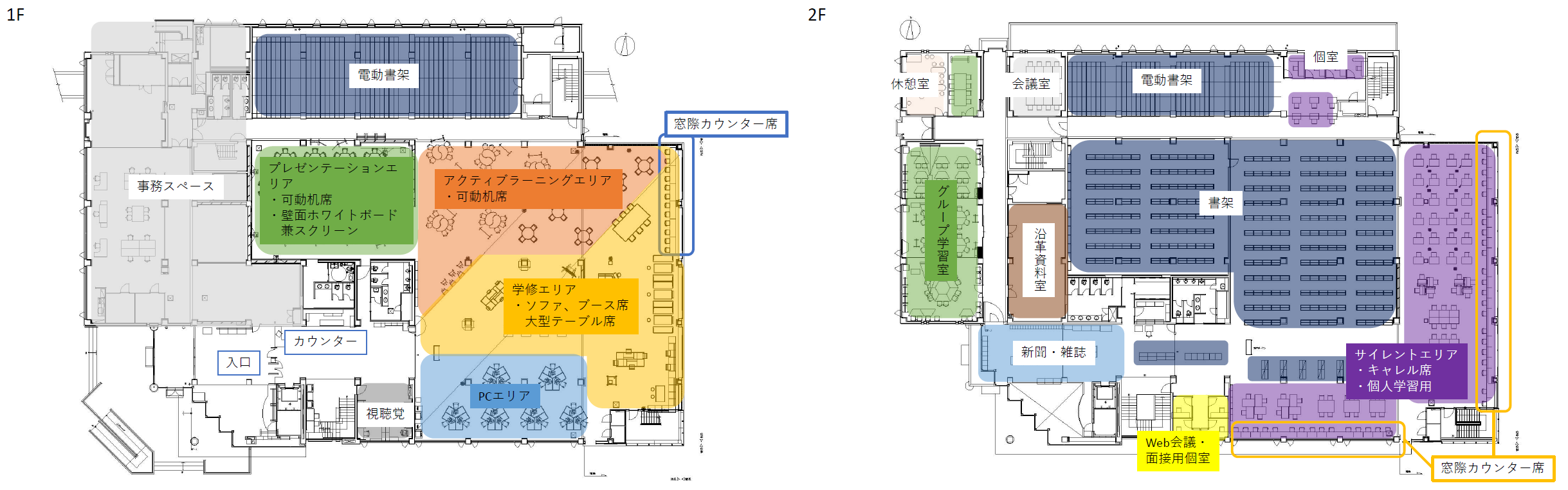 図書館2階は従来型の「書架が立ち並ぶ」フロアとなり、静かに学修するための個人席を設置します。