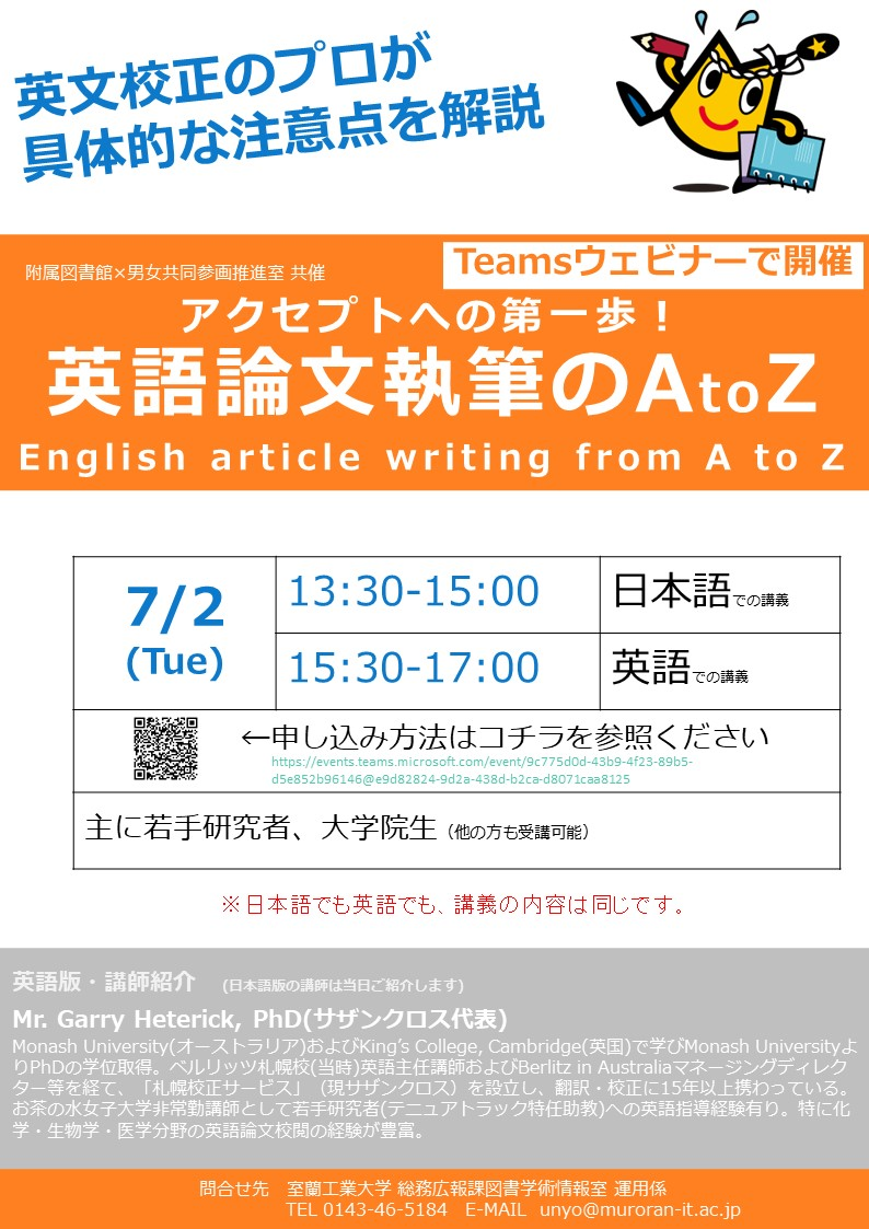 主な対象: 若手研究者、大学院生(他の方も受講可能) 内 容: 英語論文執筆上の具体的な注意点を 英文校正の専門家から学びます。 日 時:令和6年7月2日(火) 【日本語での講義】13:30-15:00(90分) 【英語での講義】 15:30-17:00(90分) ※両方とも内容は同じです 開催方法:Teamsウェビナーによるオンラインセミナー 共 催:男女共同参画推進室 講 師:Mr. Garry Heterick, PhD(サザンクロス 株式会社 代表) 申込方法:以下URLから登録願います。 https://events.teams.microsoft.com/event/9c775d0d-43b9-4f23-89b5-d5e852b96146@e9d82824-9d2a-438d-b2ca-d8071caa8125 ※「登録」ボタンを押下し、必要事項を記入願います。 ※申込後、「イベントに参加する」のボタンが記載された返信メールが届きます。 当日はこちらから参加願います。 問合せ先:総務広報課図書学術情報室運用係 0143-46-5184 |
