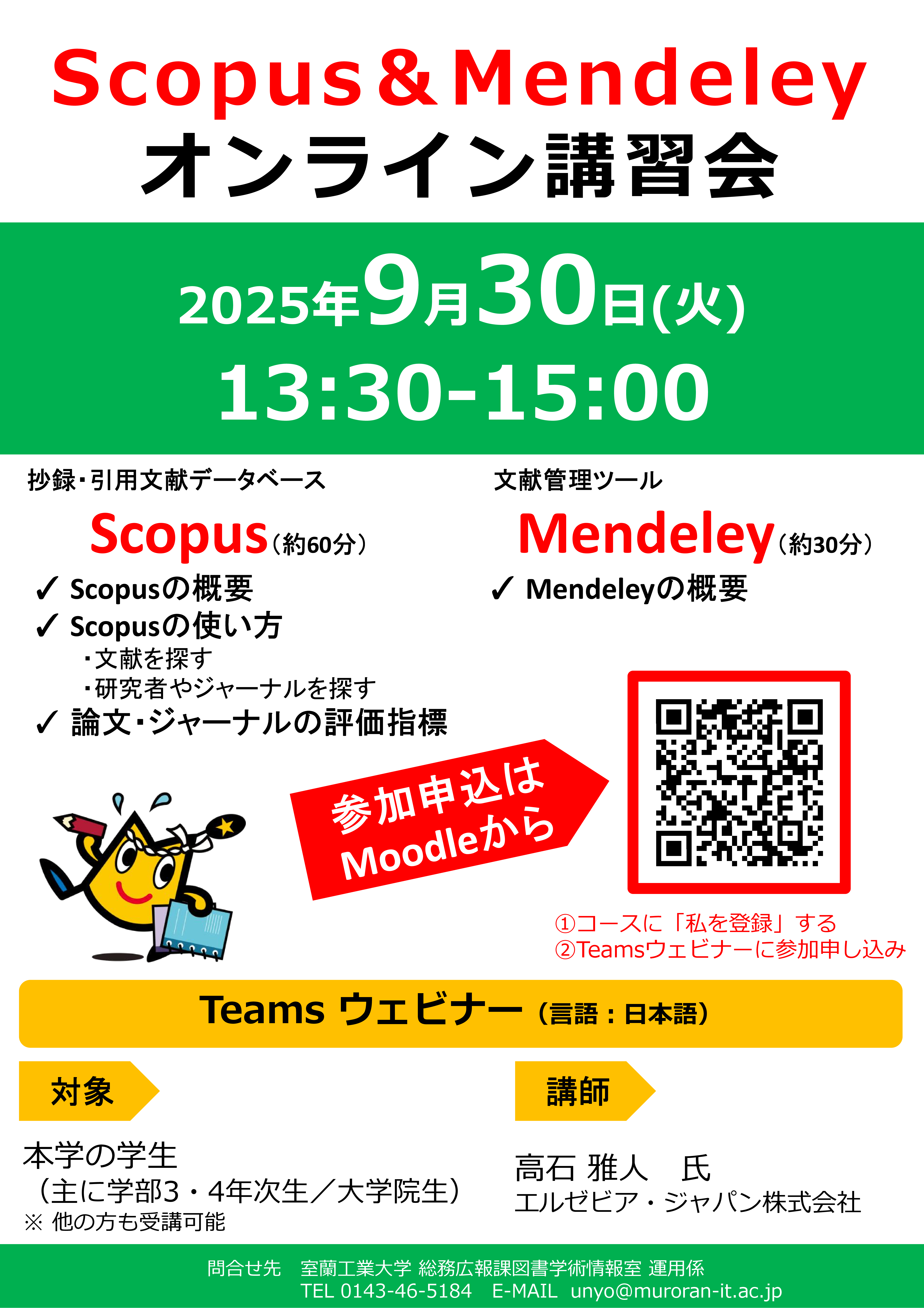 主な対象: 本学の学生(主に学部3・4年次生/大学院生) ※他の方も受講可能 内 容: ・Scopusの概要 ・Scopusの使用方法 ・論文・ジャーナルの評価指標 ・Mendeleyの概要 日 時:令和7年9月30日(火) 13:30-15:00 開催方法:Teamsウェビナー 講 師:高石 雅人 氏(エルゼビア・ジャパン株式会社) 申込方法:Moodleから「Scopus & Mendeley講習会」にコース登録し、Teamsウェビナーに参加申し込みしてください。 コース: Scopus&Mendeley講習会 | Moodle2023 問合せ先:総務広報課図書学術情報室運用係 0143-46-5184 |